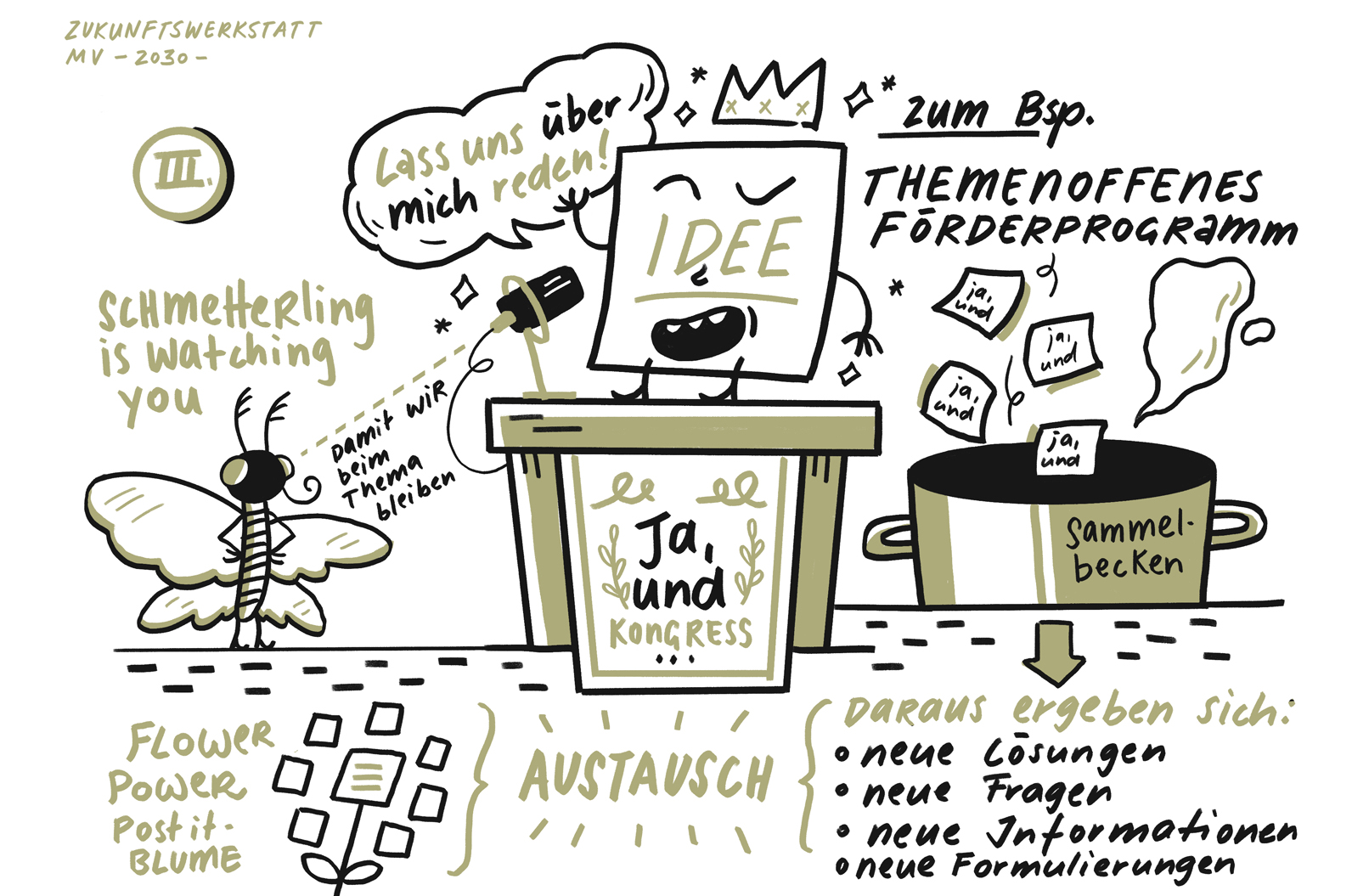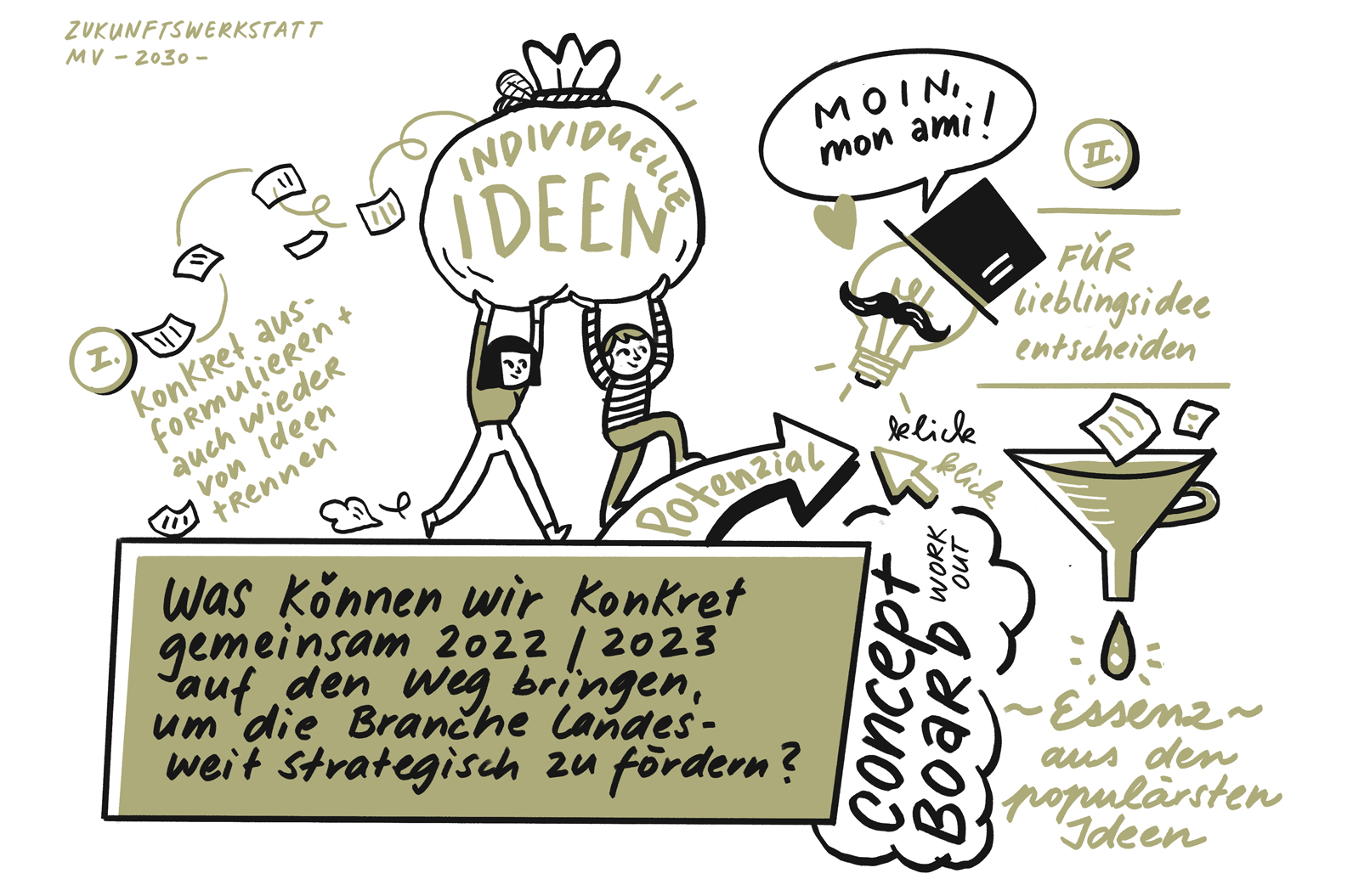 Aus den Workshops gingen zahlreiche Ideen hervor. Illustriert wurden diese von Andrea Köster (www.laquesti.com)